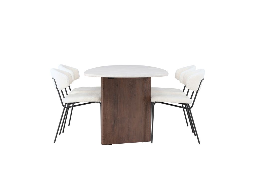 Inred ditt hem modernt och unikt med en smakfull matgrupp i skandinavisk stil som imponerar med sin genomtänkta design och trendiga utformning! Vårt ovala matbord Grönvik har en oregelbunden bordsskiva i ljusgrå MDF med marmor-look. Toppskivans stilrena utseende blir en snygg kontrast till de två tunna träskivorna i mörkbrun kulör som bär upp bordet och ger en modern och unik touch till blickfånget. Bordets mått: 180x75cm.