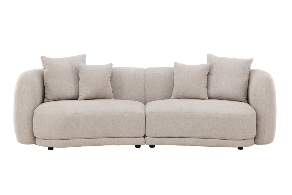 Skapa en elegant atmosfär med Cielo 3-sitssoffa i beige bouclématerial, kombinerande modern design och oöverträffad komfort.
