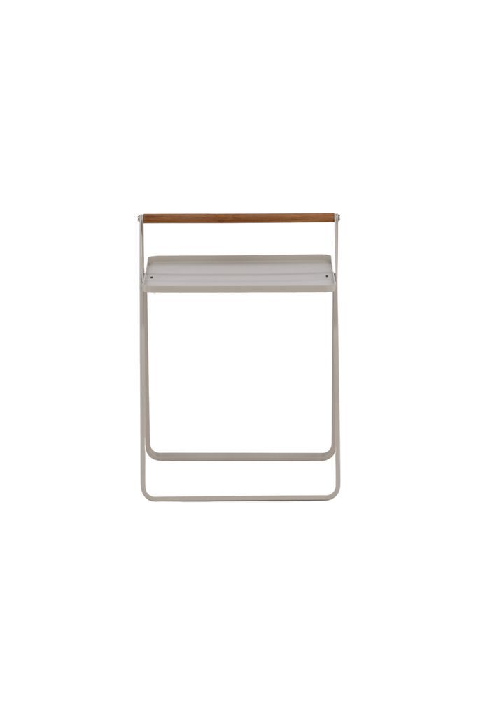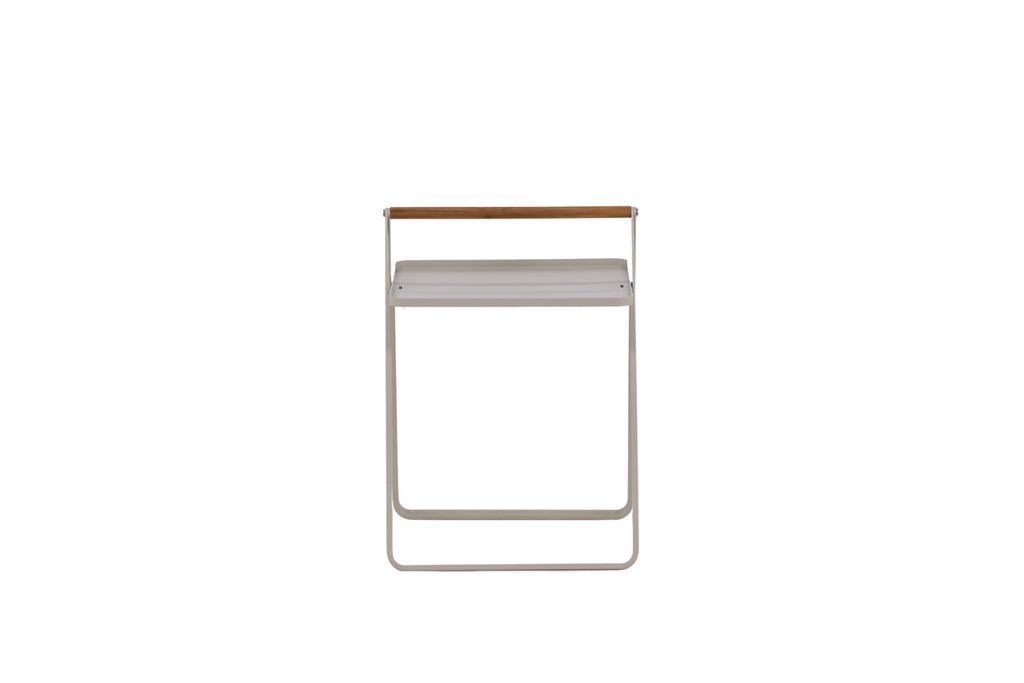 Clarin - ett stilrent sidobord i beige stål med teakhandtag. Perfekt för sommarens uteplatser.
