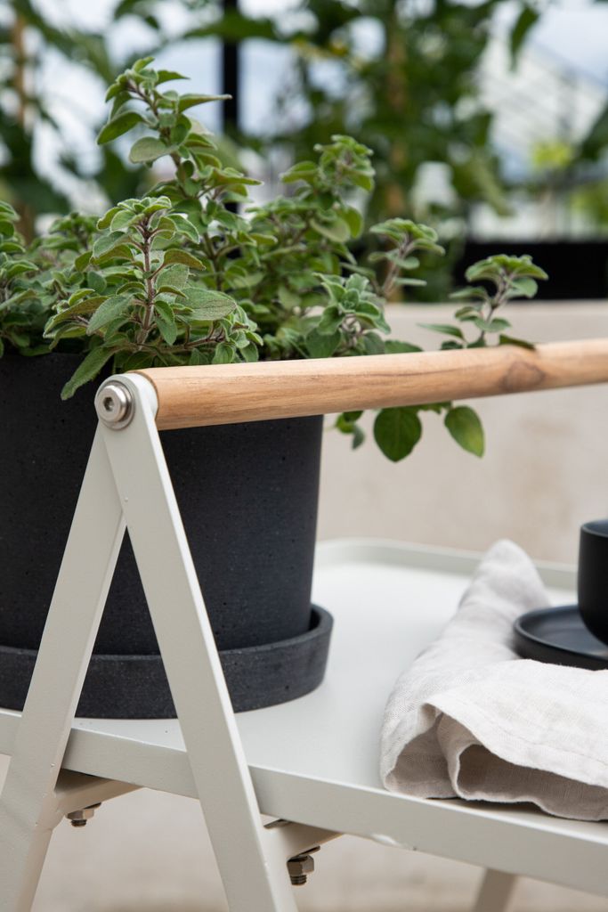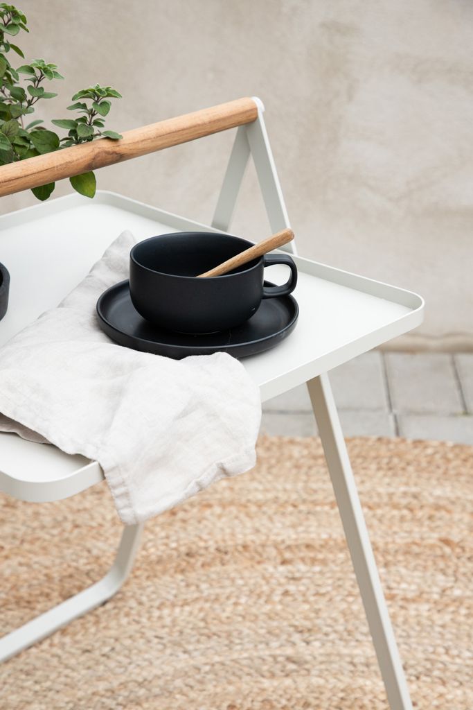 Bordets minimalistiska design kompletteras av ett dekorativt handtag i teak, vilket gör det lätt att flytta. Den tidlösa skandinaviska designen gör att bordet passar lika bra på balkongen som i trädgården.