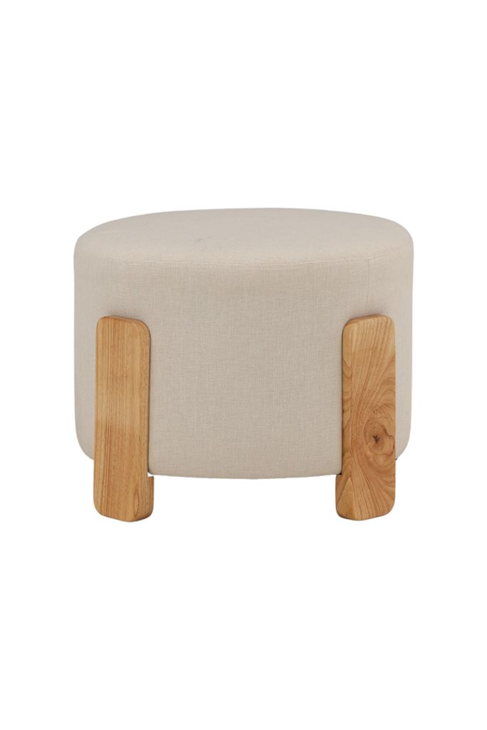 Stilsäker sittpuff i varmvitt linne och polyestertyg med ljus trästomme, perfekt för fötter eller extra sittplats.