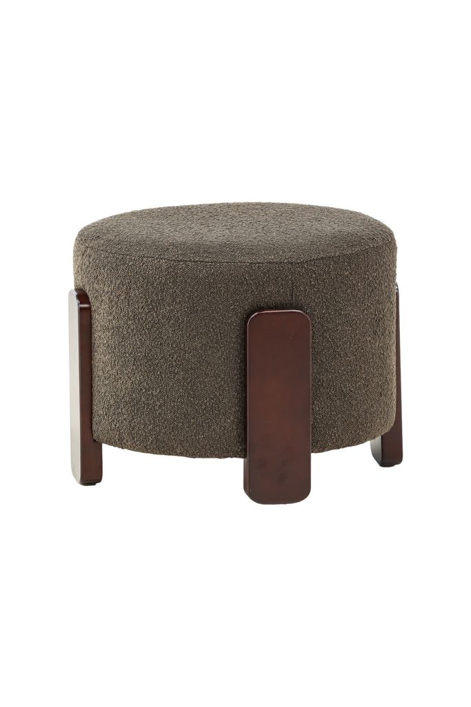 Stilsäker sittpuff i grå boucletyg och brun plywood, perfekt som fotpall eller extra sittplats.