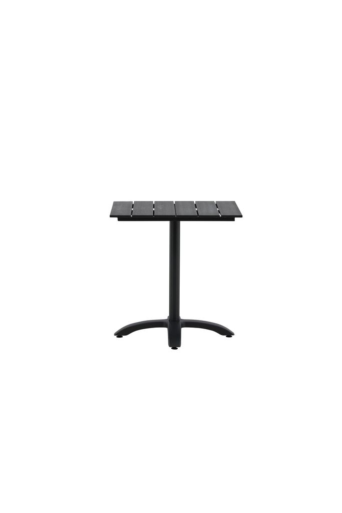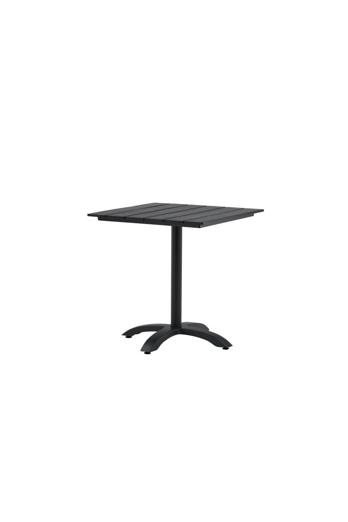Klassiskt kvadratiskt cafébord i svart aluminium och aintwood, perfekt för utomhusbruk.
