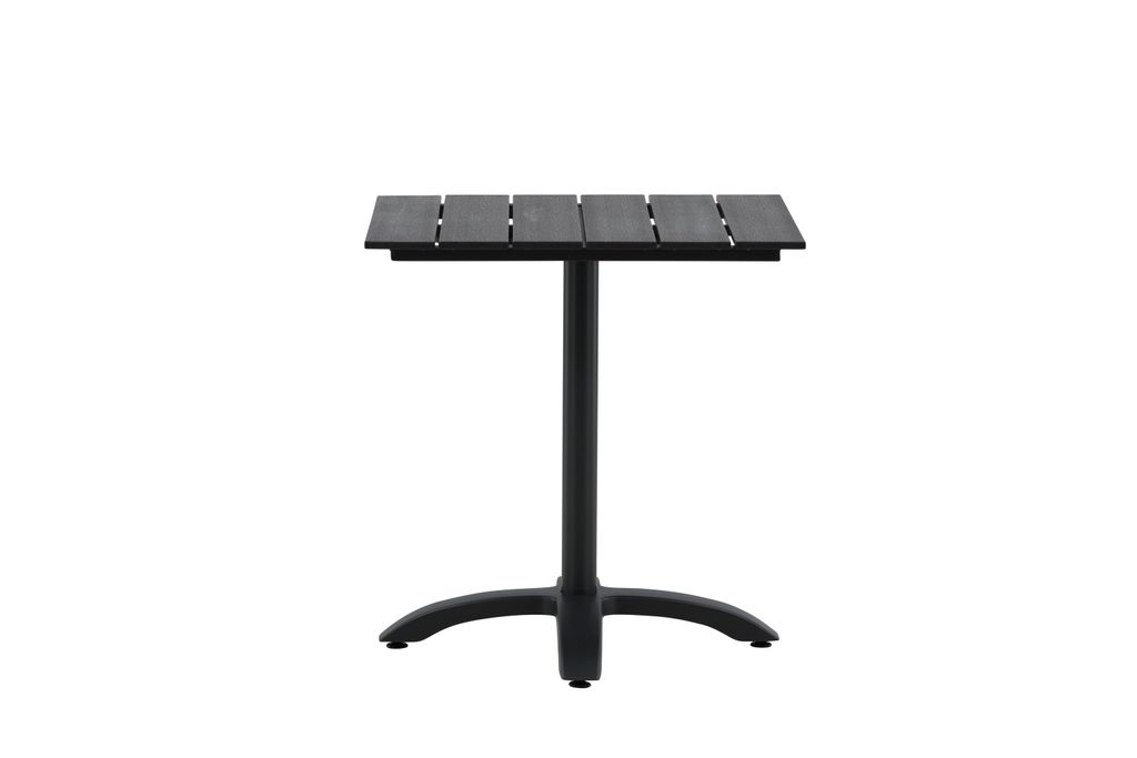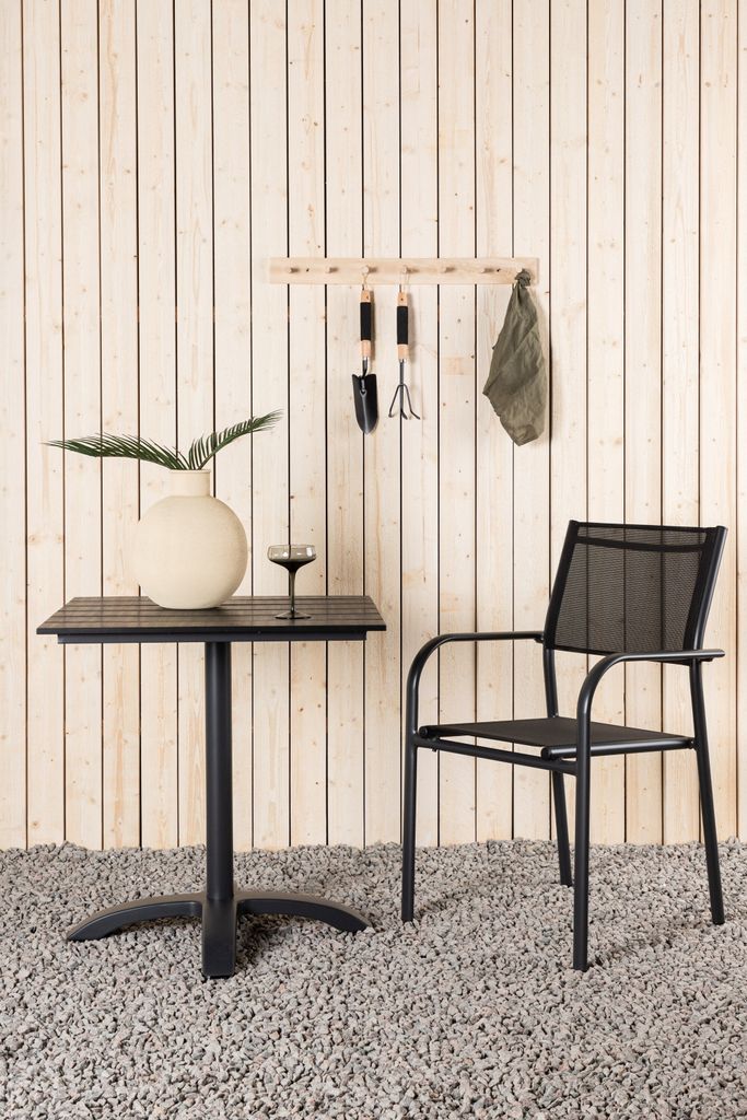 Designad med ett klassiskt kvadratiskt utseende, mäter detta bord 70x70 cm och är tillverkat av slitstarkt svart aluminium och aintwood. Den robusta konstruktionen gör bordet idealiskt för utomhusbruk, samtidigt som det erbjuder en tidlös design som passar alla utemiljöer.