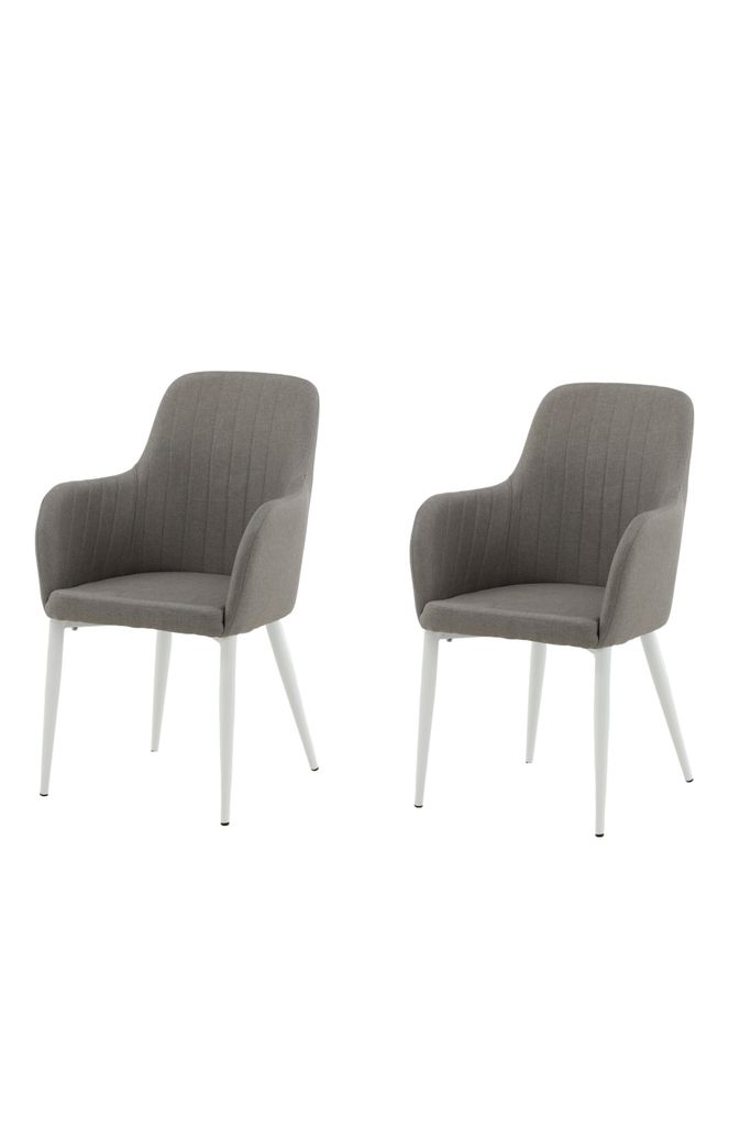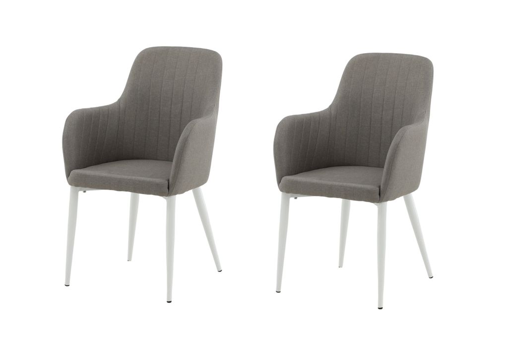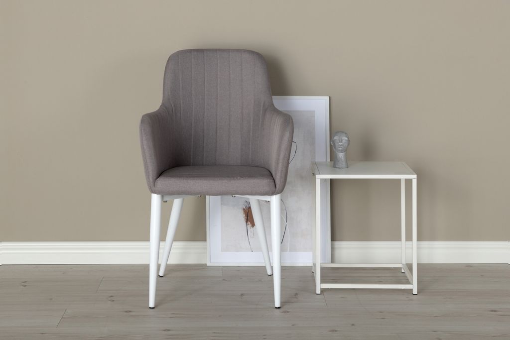 De vita pulverlackerade metallbenen ger en modern touch och kompletterar det grå tyget vackert, vilket gör stolarna till ett utmärkt val för alla moderna hem. Ett lättare montage krävs, men resultatet är en robust och estetiskt tilltalande stol.
