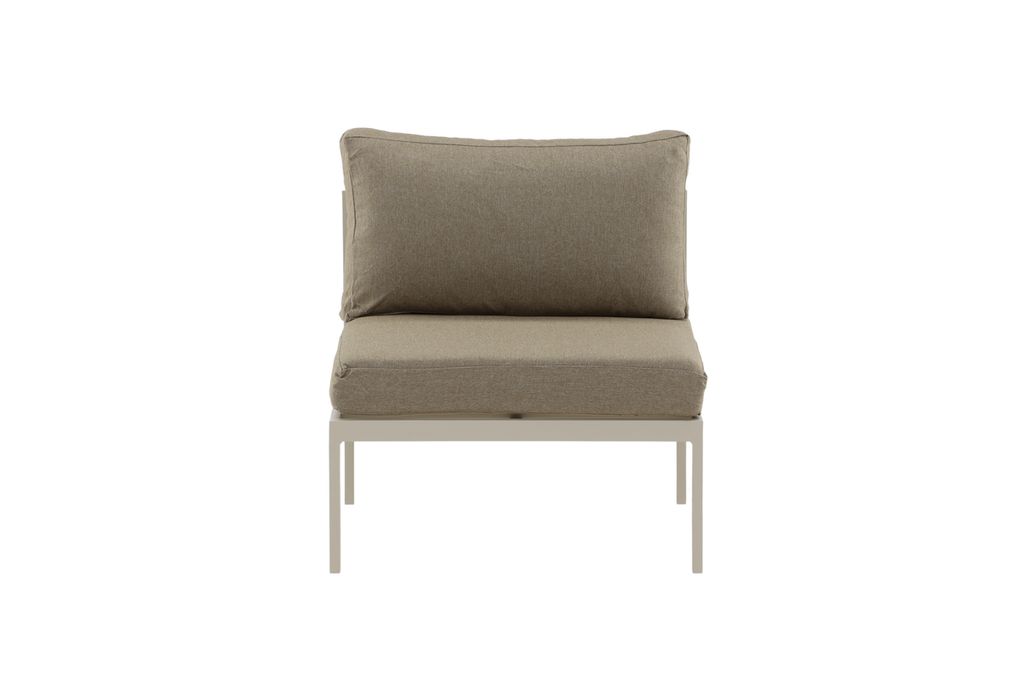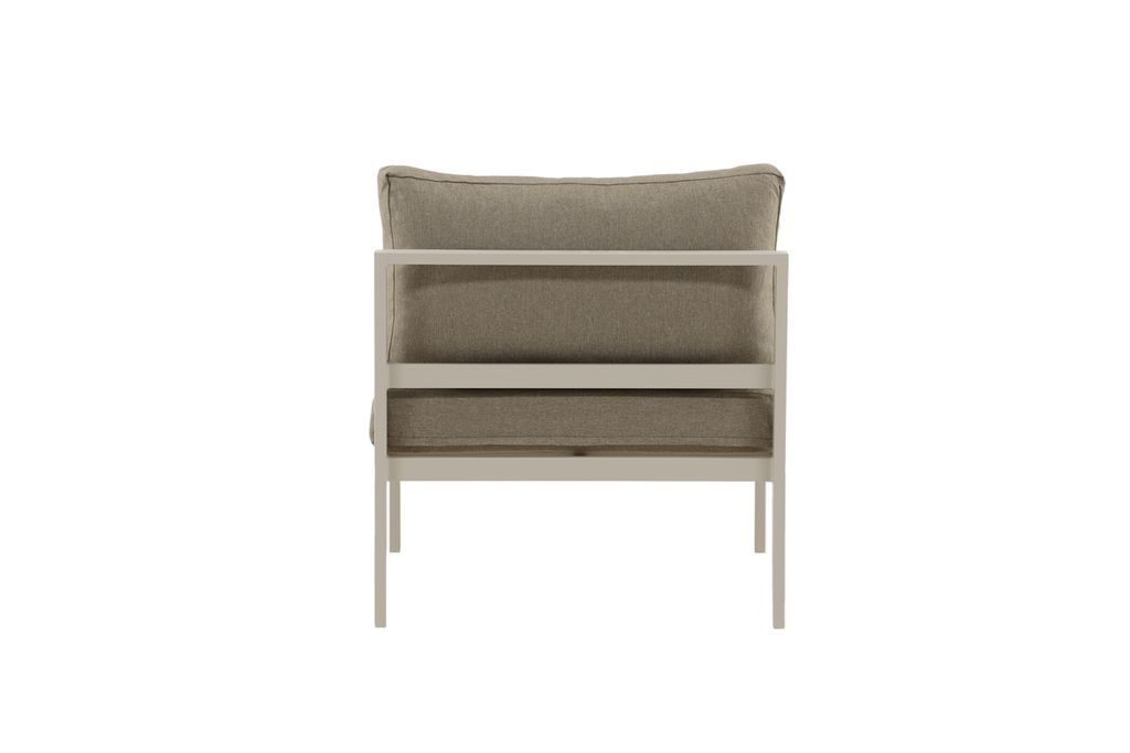 Elegant och bekväm fåtölj i beige och grått, perfekt för trädgården eller altanen.