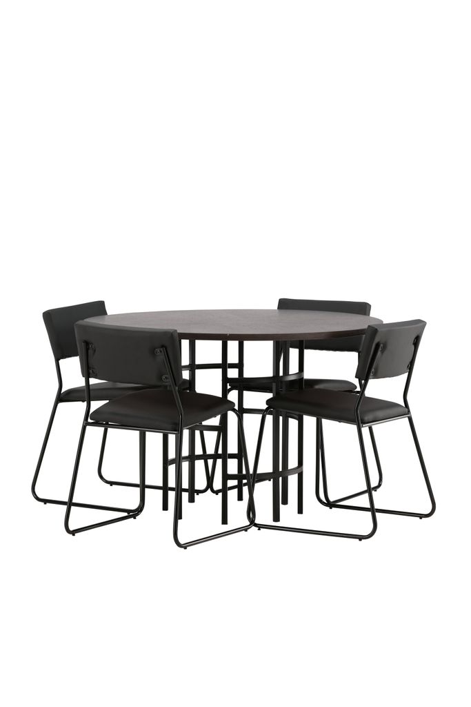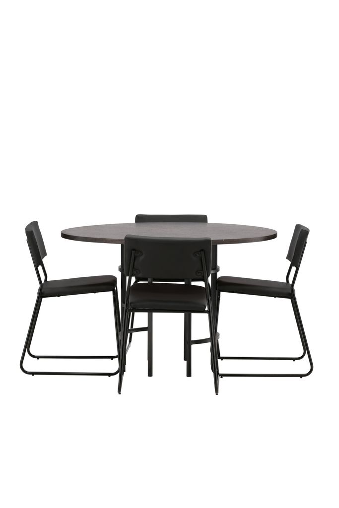 Upplev elegansen med Venture Home Copenhagen Rund Matgrupp, en perfekt kombination av stil och funktionalitet för ditt moderna hem. Den bruna bordsskivan i MDF med fanér skapar en varm och inbjudande atmosfär, medan det cylinderformade underredet i svart metall ger en chic och stabil bas.