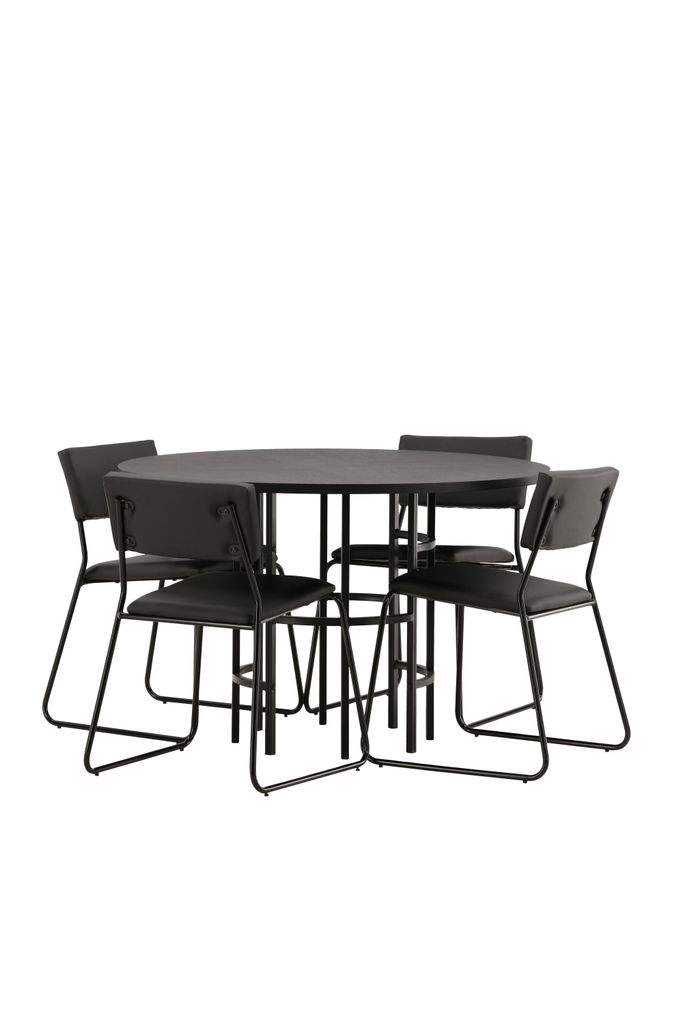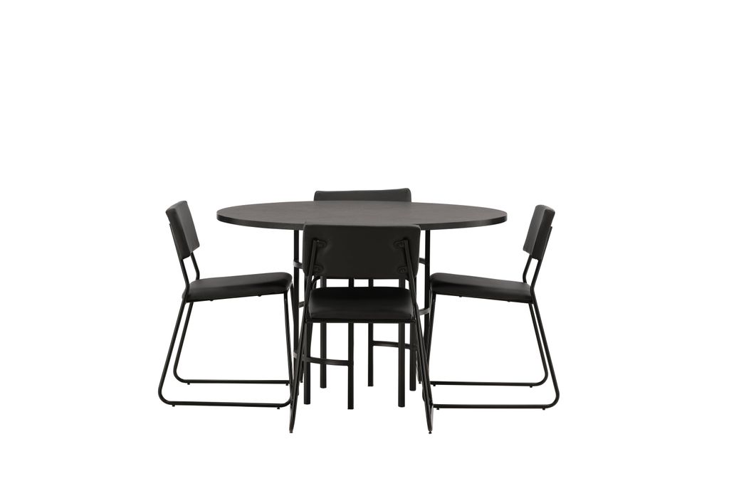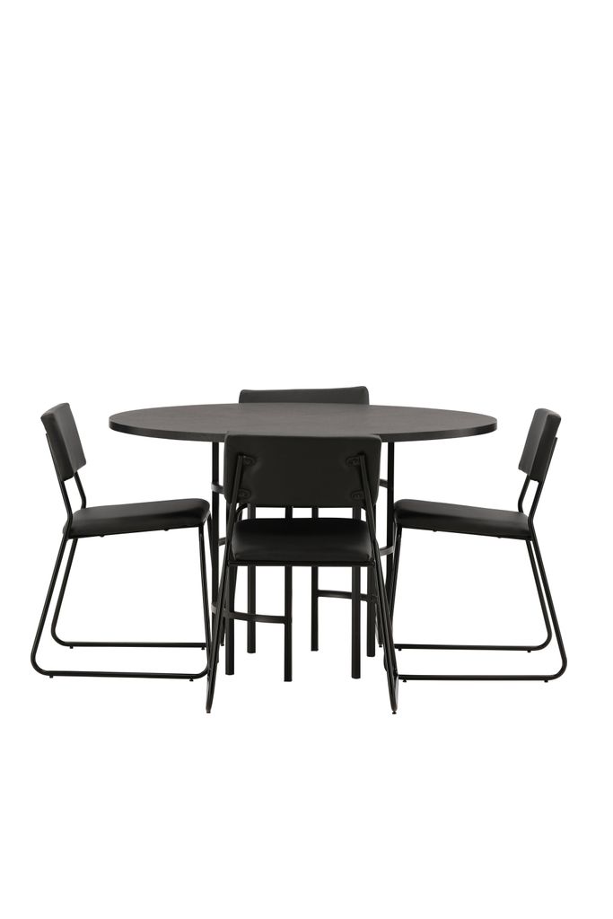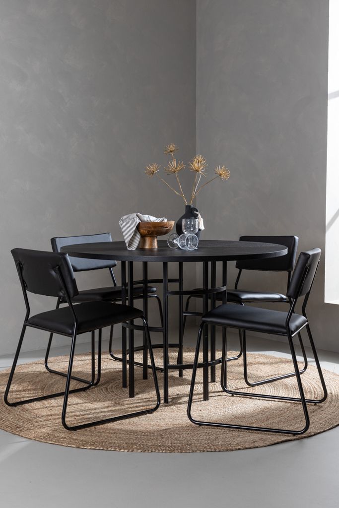 Upplev elegans och funktionalitet med Venture Home Copenhagen Rund Matgrupp. Denna matgrupp blir ett modernt blickfång i ditt hem, med en rund bordsskiva i sotig svart MDF och fanér, stödd av ett cylinderformat underrede i svart metall. Den minimalistiska designen smälter lätt in i olika interiörer och skapar en inbjudande atmosfär.