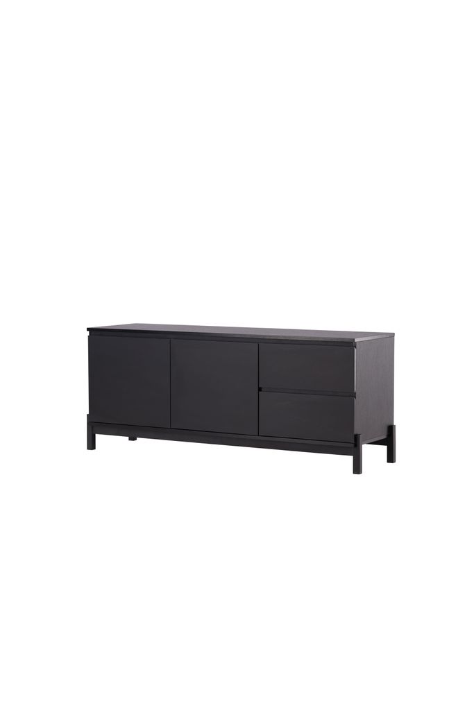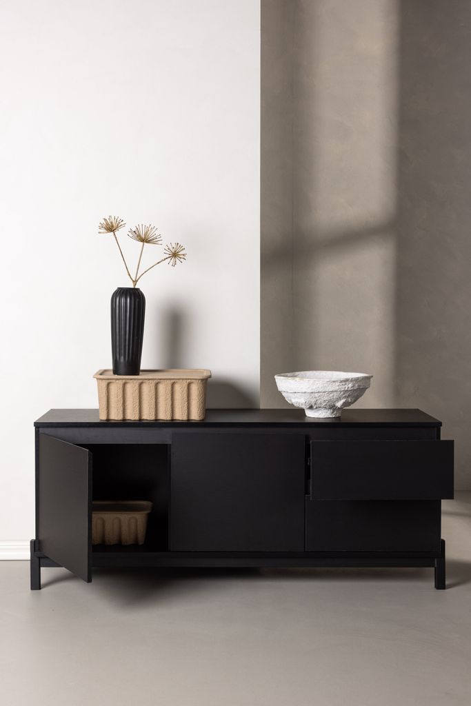 Stilren tv-bänk eller skänk i svart MDF med generös förvaring och tidlös design.