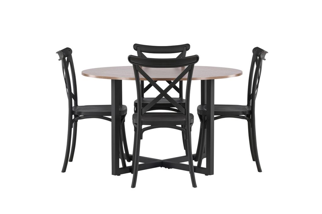 Pampigt och inbjudande! Vårt runda matbord Durango har en valnötsfärgad bordsskiva i MDF och raka bordsben i svart stål som samlar sig i ett kryss på golvet. Här tillsammans med svarta matstolar från serien Crosett. Stolen är genomgående tillverkad i det behändiga materialet plast och har en matt svart kulör som står sig över tid. Här får du en perfekt matgrupp till vardagsrummet! Bordets mått: 120cm.