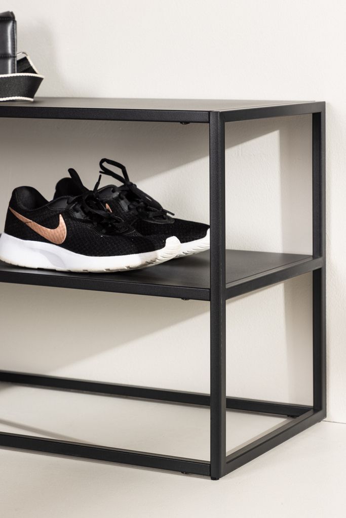 Elegant sidobord i svart metall med öppen förvaring. Perfekt för stilren organisation i alla rum.