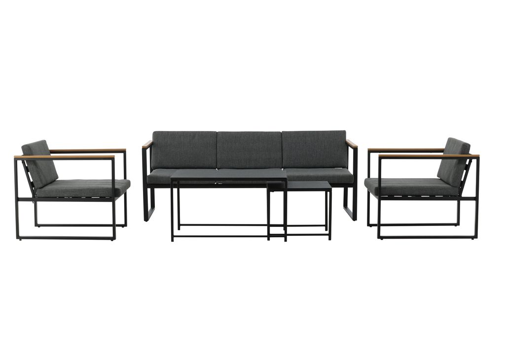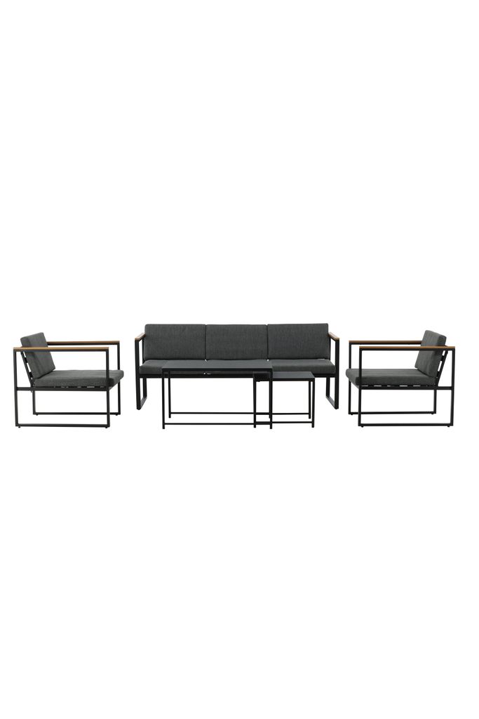 Komplett soffgrupp med stilren design i svart stål och sprayglas, med grå slitstarka dynor för fem gäster.