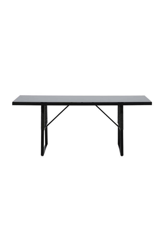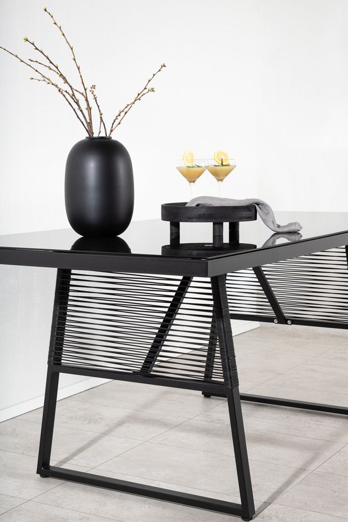Den mörka glasbordsskivan ger en sofistikerad touch, medan de unika repdetaljerna på bordsstommen bidrar med en kaxig och modern känsla. Bordets minimalistiska design gör det lätt att matcha med stolar från samma serie för en komplett och enhetlig matgrupp.
