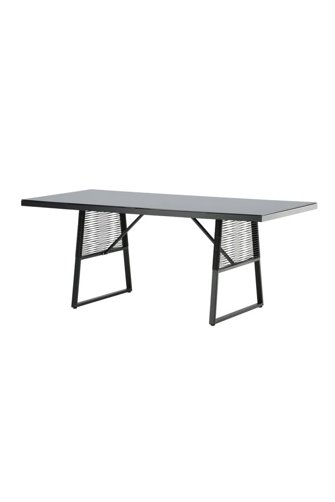 Dallas är ett snyggt matbord i svart aluminium med glasbordsskiva och unika repdetaljer, perfekt för sommarens middagar.