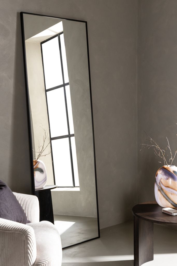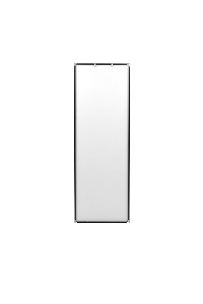 Design och Material: Spegeln är inramad med en tunn svart ram av aluminium som ger en modern touch. Själva spegelytan är tillverkad av högkvalitativt glas som reflekterar ljuset optimalt för att skapa en känsla av rymd.