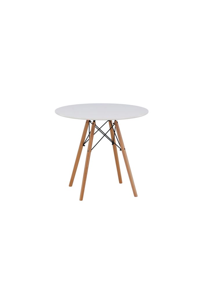 Runt matbord i vit MDF och bokträ för sociala och inbjudande måltider, med dekorativa ståldetaljer.