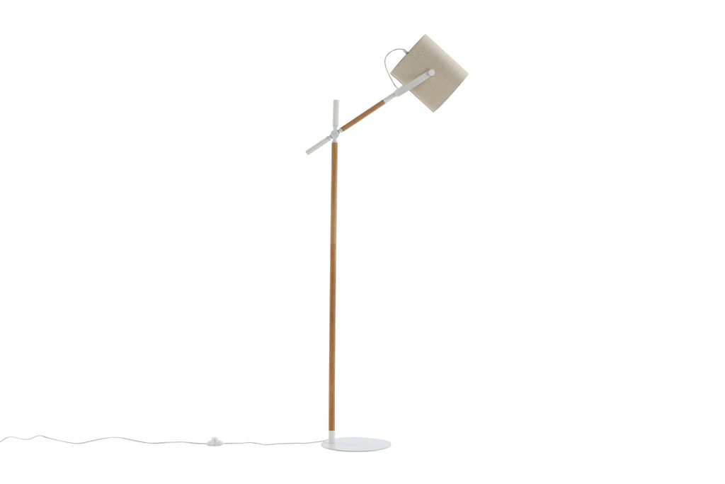 Elegant golvlampa med justerbar axel och linneskärm som ger mjukt sken. Perfekt för stilren inredning och behaglig belysning.