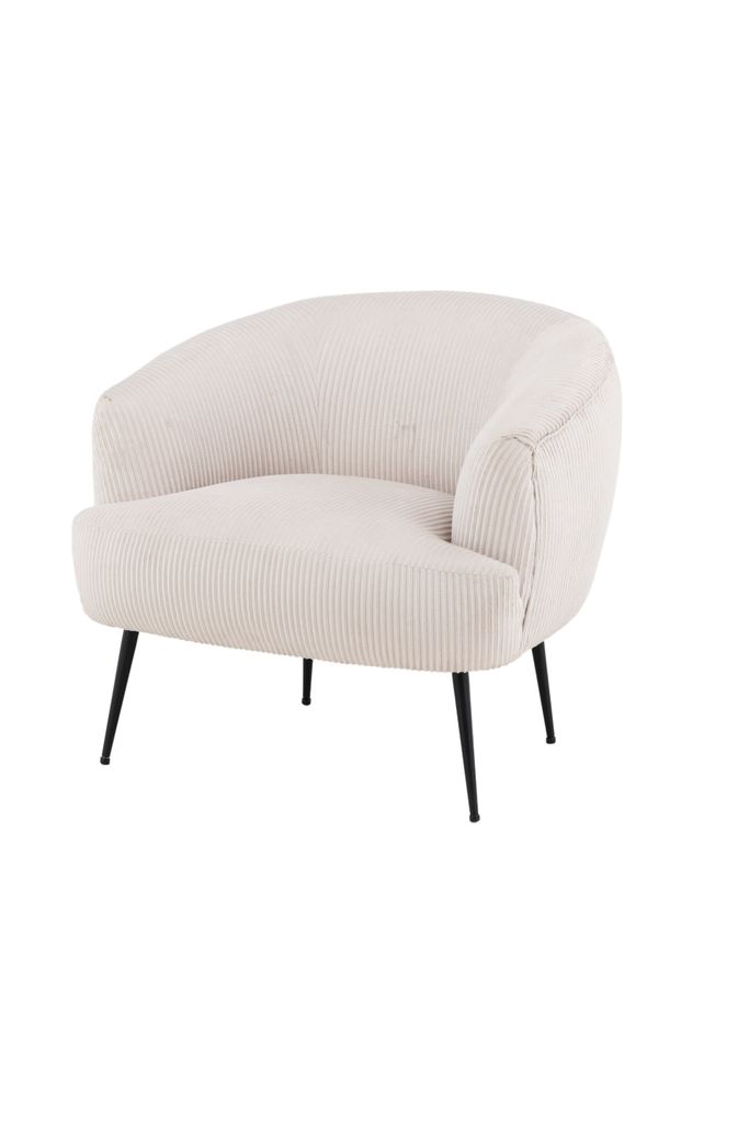 Modern fåtölj med 50-tals nostalgi, klädd i ljust beige manchestertyg. Perfekt för stil och komfort.