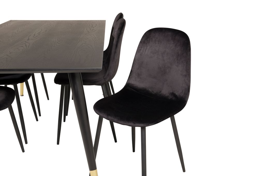 Trendigt matbord i skandinavisk design med svart MDF-skiva och mässingsdetaljer. Perfekt för stilrena måltider.