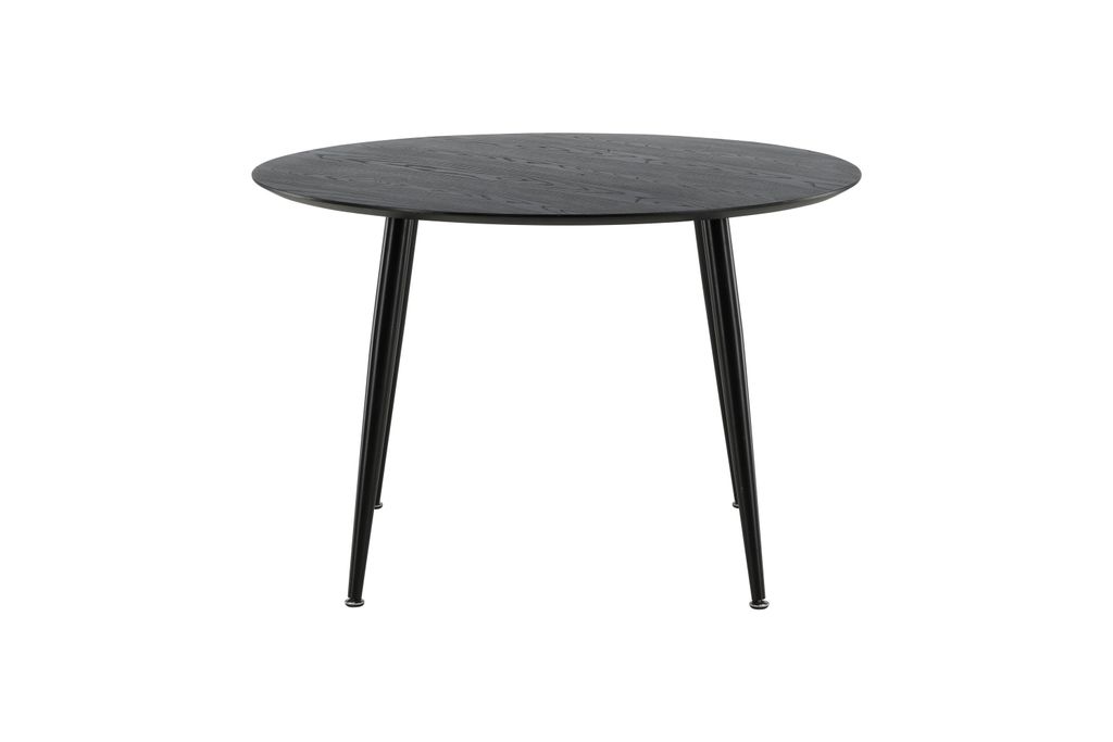 Elegant runt matbord med svart MDF-skiva och metallben för en stilren och modern känsla.
