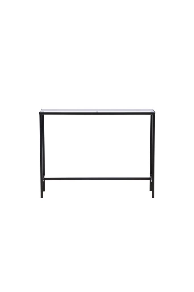 Stilrent sidobord i glas och svart stålram, perfekt för modern inredning med generösa mått på 100x30 cm.