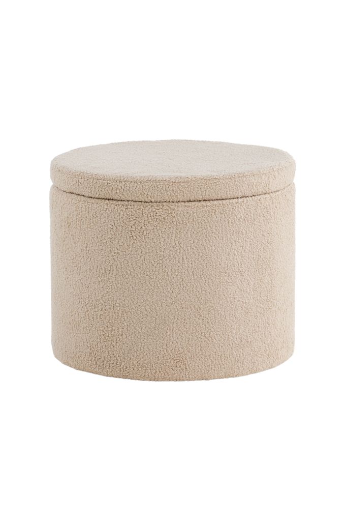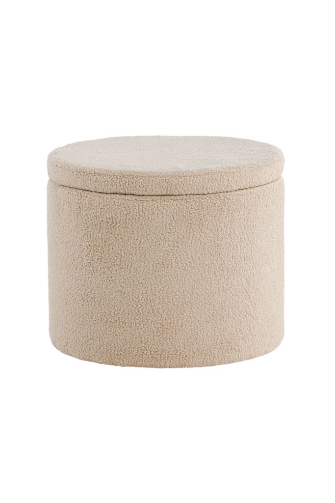 Stilren och funktionell sittpuff i beige teddytyg med dold förvaring. Perfekt som extra sittplats eller fotpall.