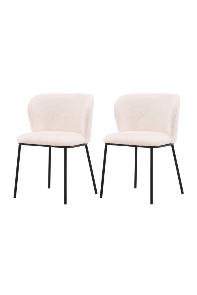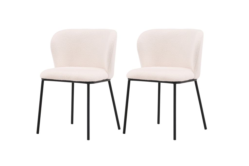 Förhöj ditt hem med Venture Home Edina Matstol 2-pack. Dessa moderna stolar kombinerar stil och bekvämlighet med sin helklädda sits i trendigt vitt boucletyg och eleganta svarta metallben. Den stilrena designen gör dem perfekta för alla inredningsstilar, samtidigt som de erbjuder en bekväm plats för långa måltider.