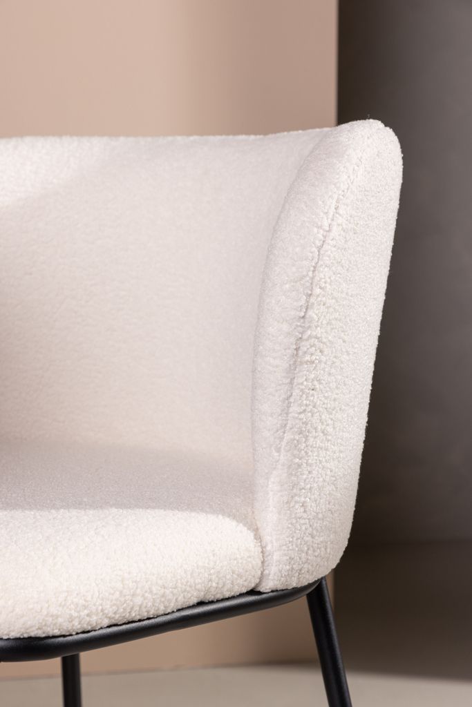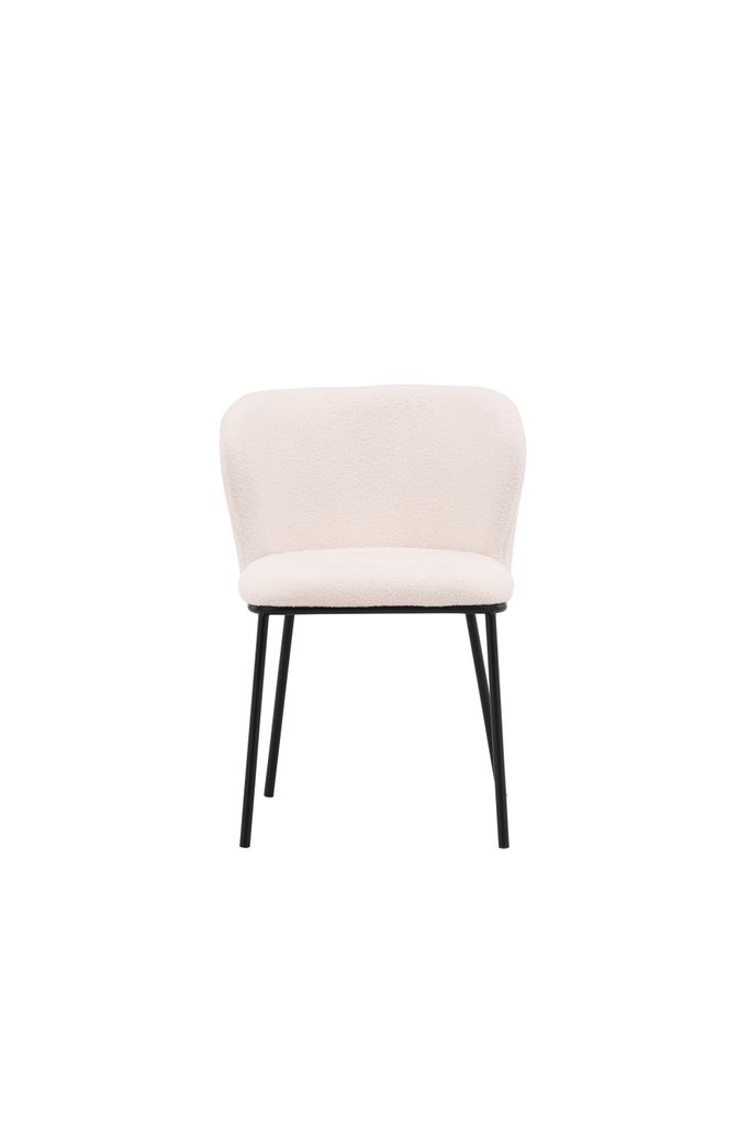 Modern matstol i vitt boucletyg med minimalistiska svarta metallben. Designad för stil och komfort.