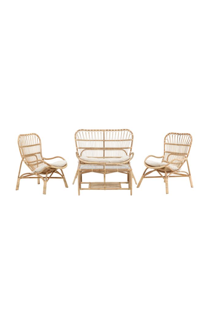 Den rektangulära bordsskivan i glas ger en modern touch till gruppen medan den lägre hyllan erbjuder praktisk förvaring. Möbelns design och detaljer framhäver den naturliga skönheten i rottingen, vilket gör det till ett blickfång i varje rum.