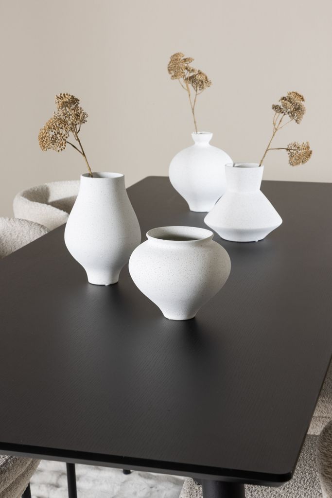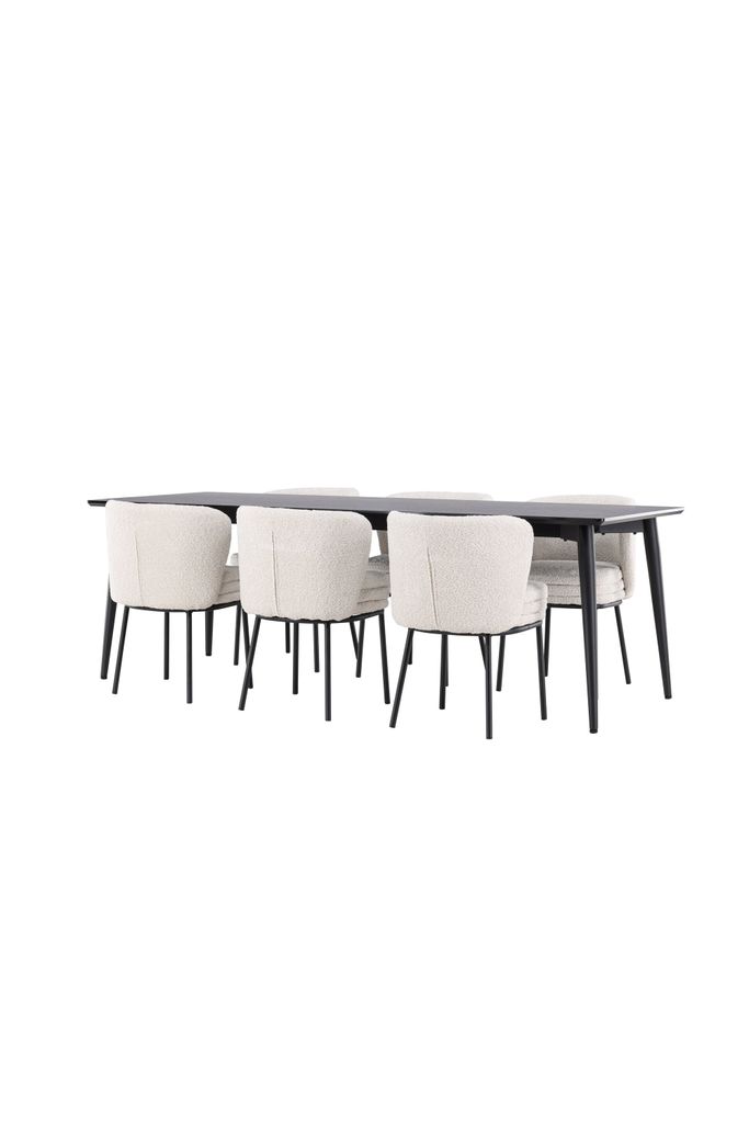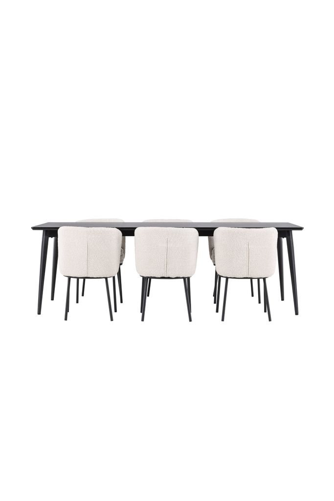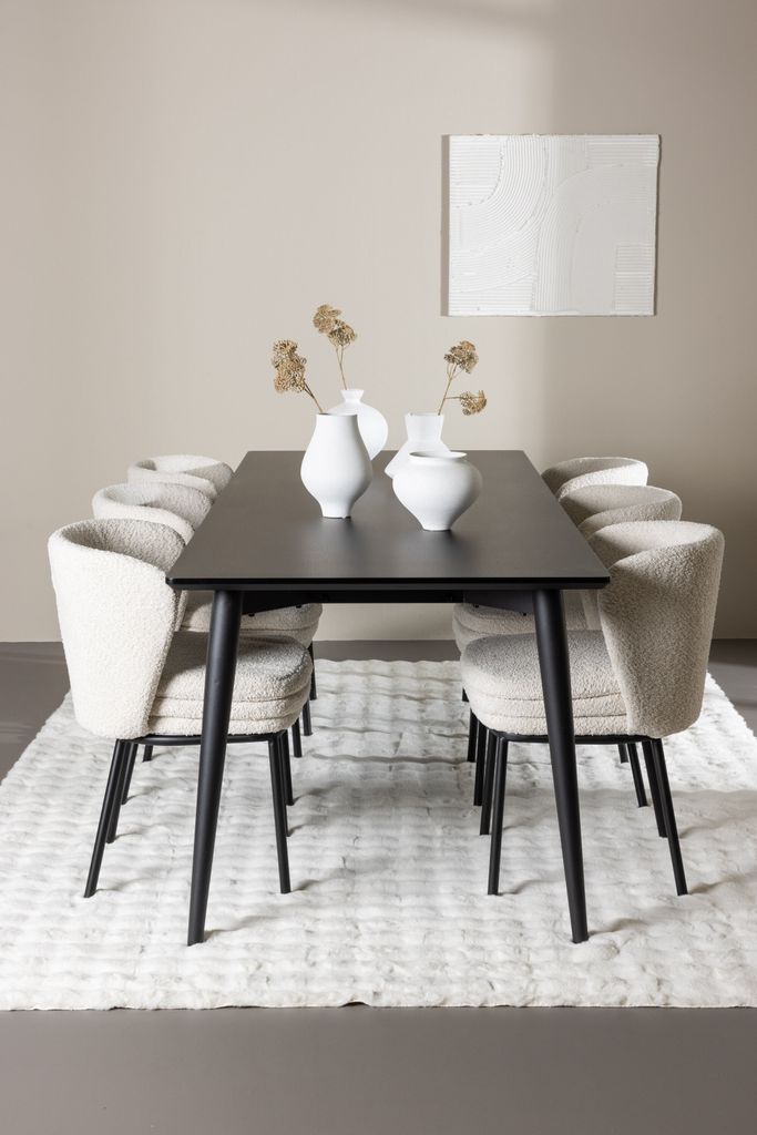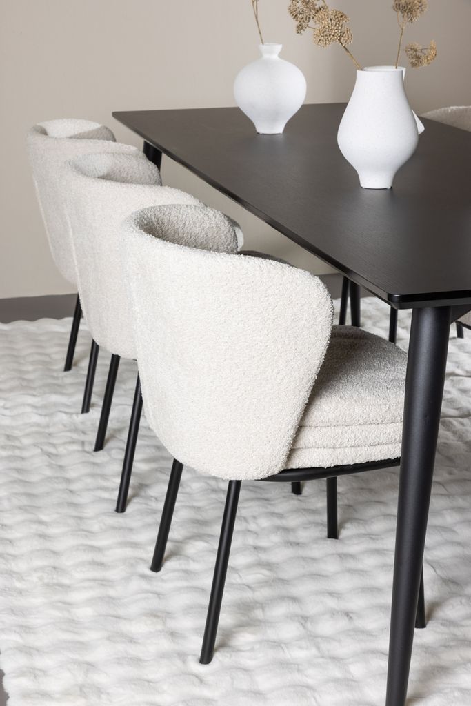 Upptäck elegant matgrupp med Agnes-stolen i vit bouclé och robusta Ellis-bordet i svart MDF.
