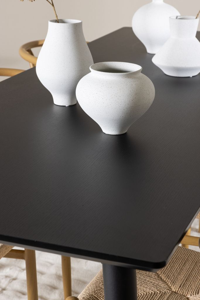 Ellis-matbordet är ett robust och stilfullt inslag i ditt hem. Med sin svarta bordsskiva av MDF och kraftiga stålben erbjuder det både stabilitet och estetik. Bordets generösa mått på 230x85 cm gör det idealiskt för större middagar och sociala sammankomster.