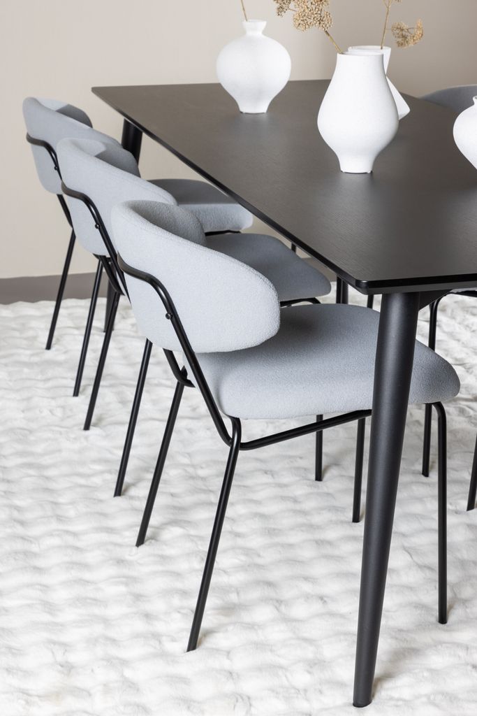 Chico-stolarna är klädda i en lyxig blå bouclé, vilket ger en mjuk och behaglig känsla. Stolarna har ben i svart stål, vilket skapar en elegant kontrast och stilren design. Chico-stolarna levereras i en praktisk förpackning om två och är designade för att skapa en varm och inbjudande känsla i din matsal.