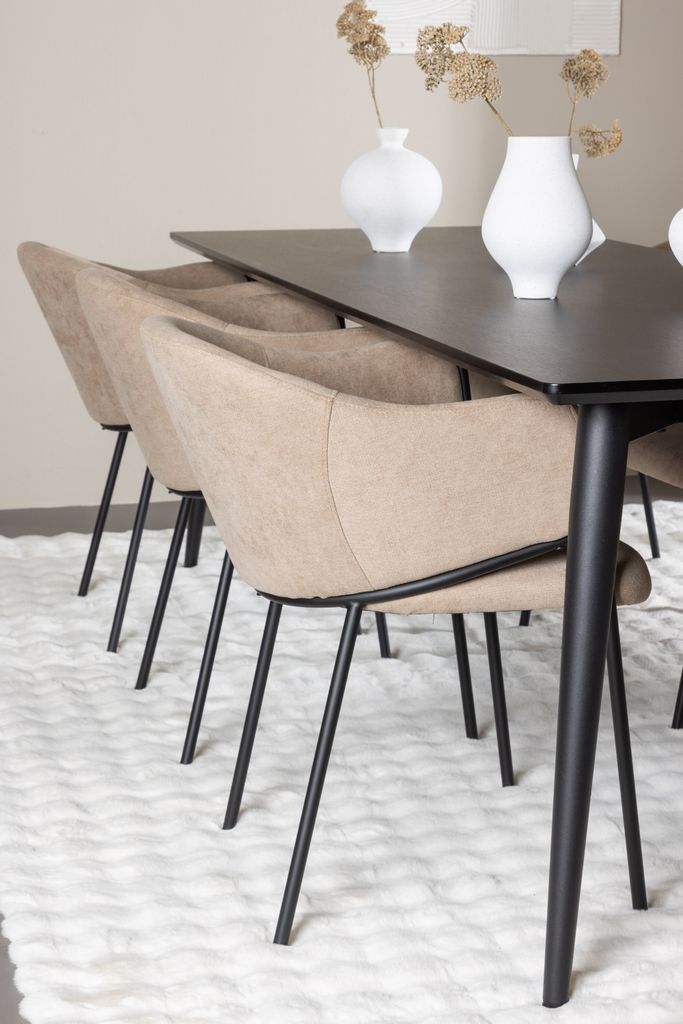Evelina Matstol: Evelina stolen ger en varm och inbjudande känsla med sin sits klädd i mjuk beige polyester linen. Den jordnära tonen kompletterar bordets moderna utseende och skapar en harmonisk atmosfär. Stolens robusta konstruktion garanterar komfort och pålitlighet, vilket gör den till ett idealiskt val för långa och trevliga måltider.