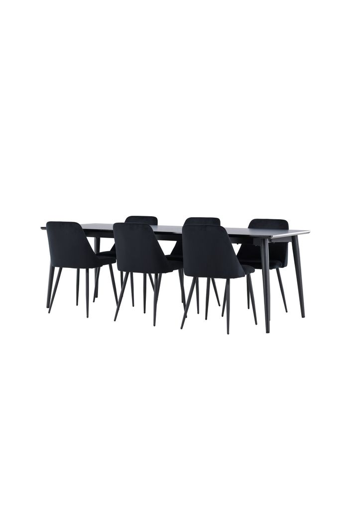 Elegant matgrupp med svart sammet och robust MDF-bord för stil och komfort.
