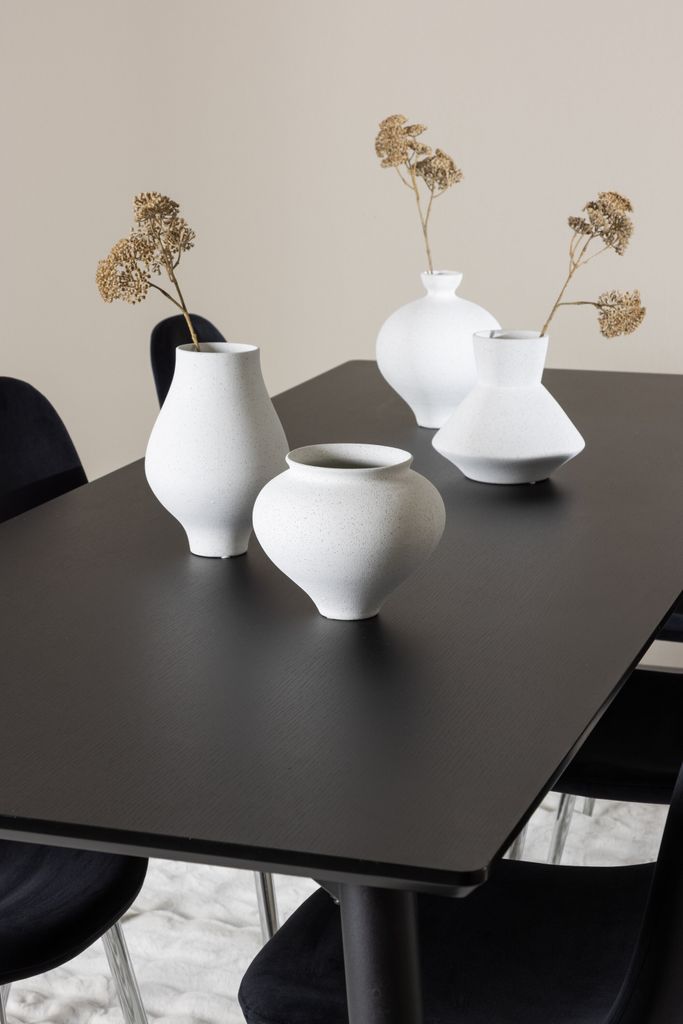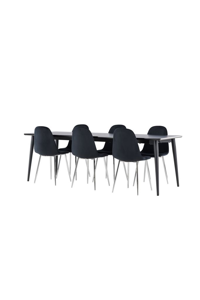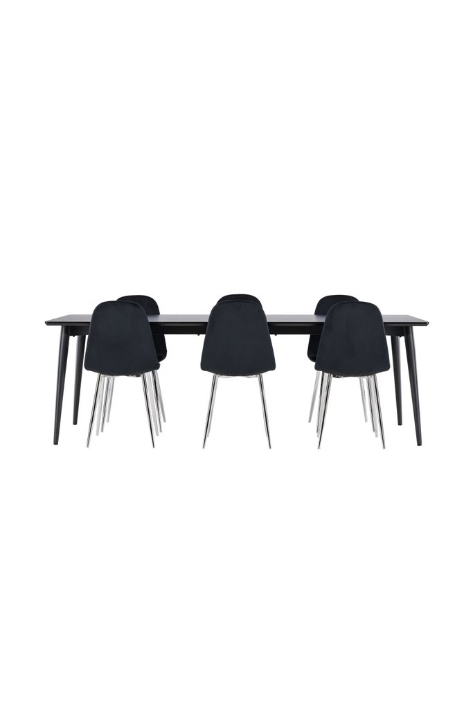 Ge ditt hem en sofistikerad och modern känsla med vår stiliga matgrupp bestående av matstolarna Polar och matbordet Ellis. Den eleganta Polar-matstolen erbjuder en helklädd design med ben i kromad metall som ger en lyxig touch. Den lätt rundade ryggen och sitsen i smäckert svart sammetstyg med mjuk stoppning säkerställer extra komfort. Här slipper du kompromissa mellan bekvämlighet och design, då stolen är en stilfull detalj som höjer rummets estetik.