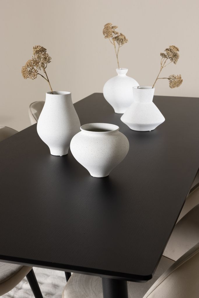 Förvandla din matplats med stil och komfort. Kombinera elegansen i ett svart bord med beige sammetsstolar.