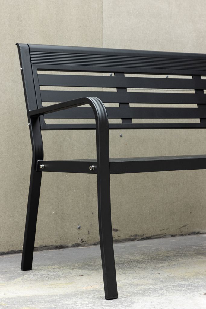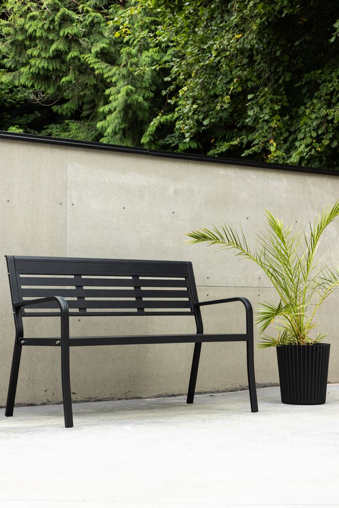 Elvas bänk i elegant svart aluminium erbjuder stil och komfort för trädgård eller uteplats.