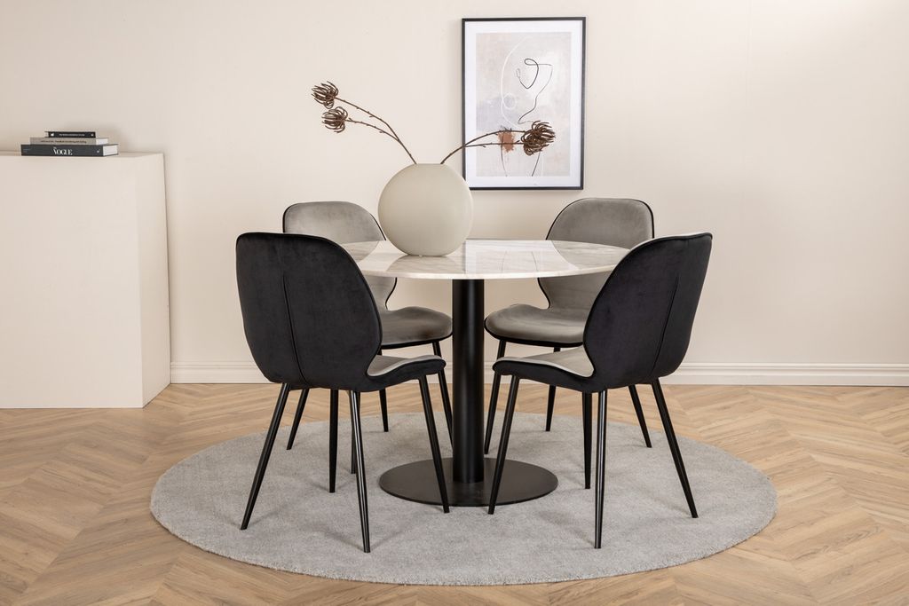 Ett runt matbord passar utmärkt för att skapa en inbjudande känsla - här hamnar ingen på kanten! Vårt runda matbord Estelle är både elegant och praktiskt. Bordet har en blank bordsskiva i vit, spräcklig marmor och ett cylinderformat underrede i svart metall. Här tillsammans med 4st matstolar från serien Emma. Stolarna har en figurnära och stilren utformning med en sits i ljusgrå sammet och stolsrygg i svart sammet samt stolsben i järn. Inred inbjudande och stilrent!