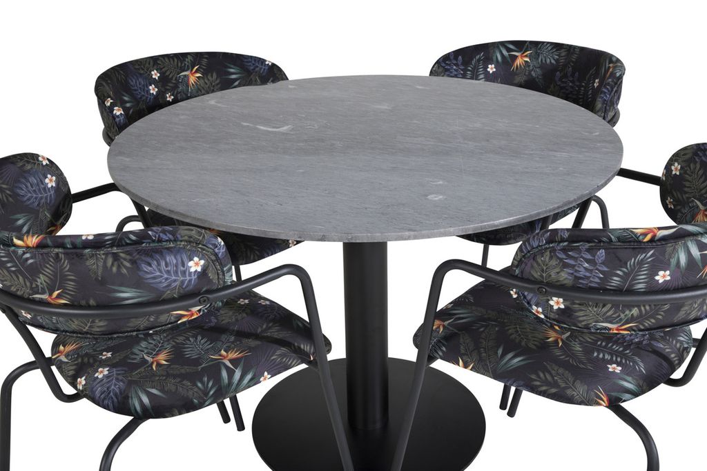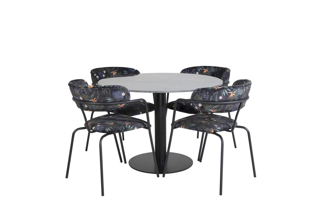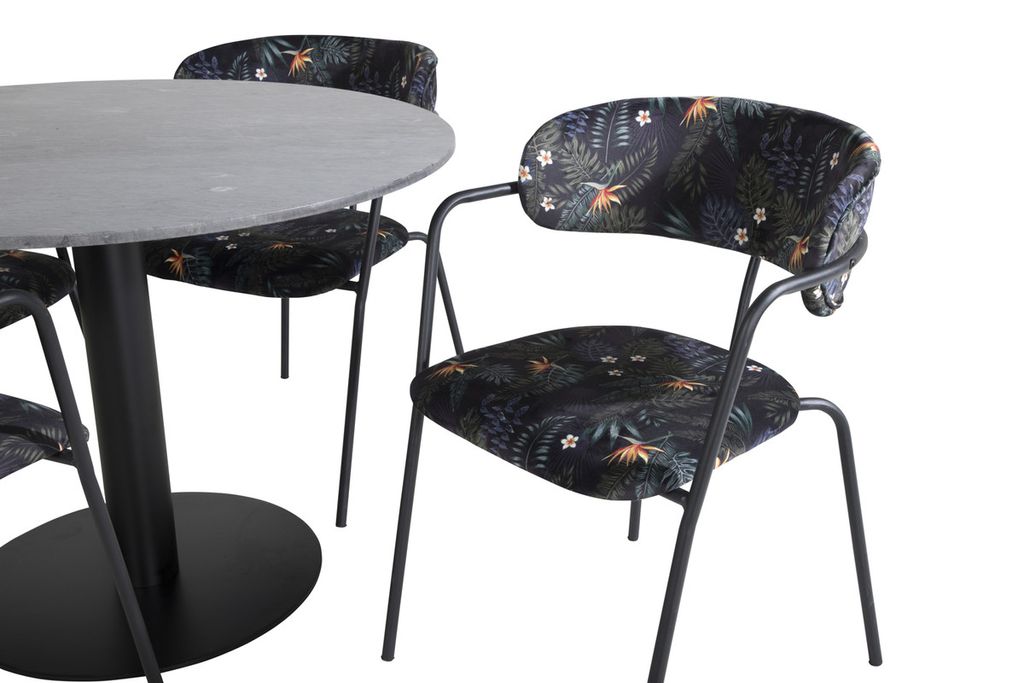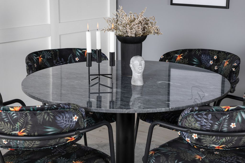 Matbord Estelle i en vacker marmor, tillsammans med bekväma svarta blommönstrade matstolar i serien Arrow - här får du en matgrupp att längta hem till!