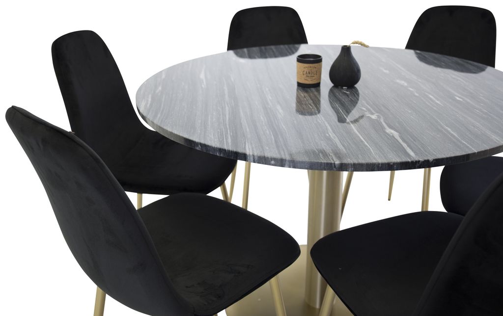 Venture Home Estelle Rund Matgrupp erbjuder en perfekt balans mellan modern design och funktionalitet. Bordet har en elegant rund design med en marmormönstrad yta som ger en lyxig känsla. De fem medföljande Polar-stolarna är klädda i mjuk svart sammet, vilket ger både komfort och stil. Stolarna har robusta ben i en gyllene metallfinish, vilket ger både stabilitet och ett trendigt utseende.