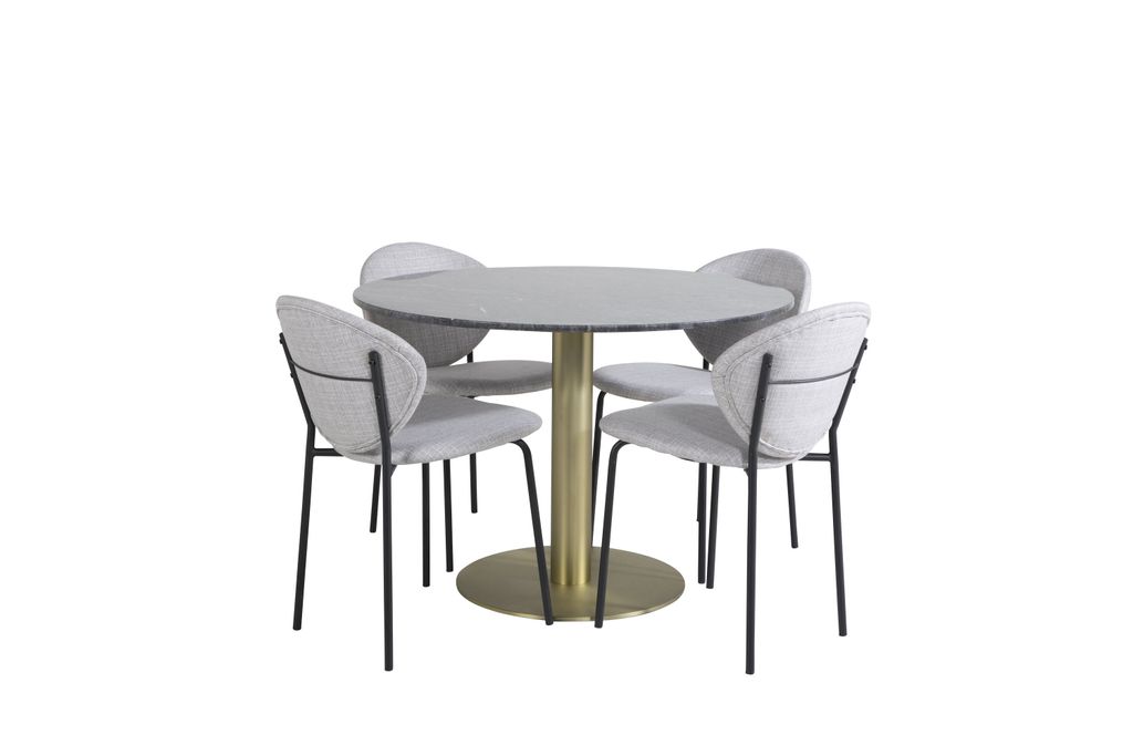 - Design: Det eleganta bordsunderredet i mässing kompletterar marmorskivan och skapar ett harmoniskt intryck. Stolarna har en modern design med svängda ryggstöd som ger både stil och komfort.