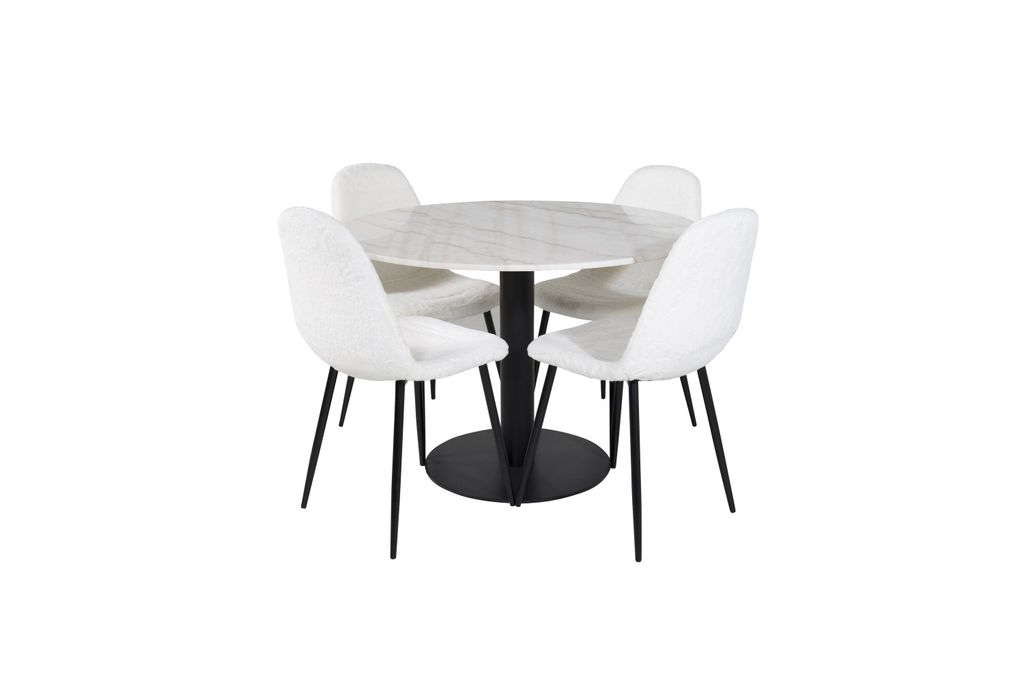 Matstolarna Polar är klädda i vitt fluffigt polyester, vilket inte bara ger en lyxig känsla utan även hög sittkomfort. Designen bjuder in till långa och trevliga middagar med vänner och familj.