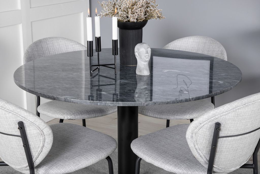 Det eleganta matbordet i vacker marmor i serien Estelle tillsammans med sittvänliga matstolar i serien Vault - en matgrupp som bjuder in till många härliga sociala stunder.