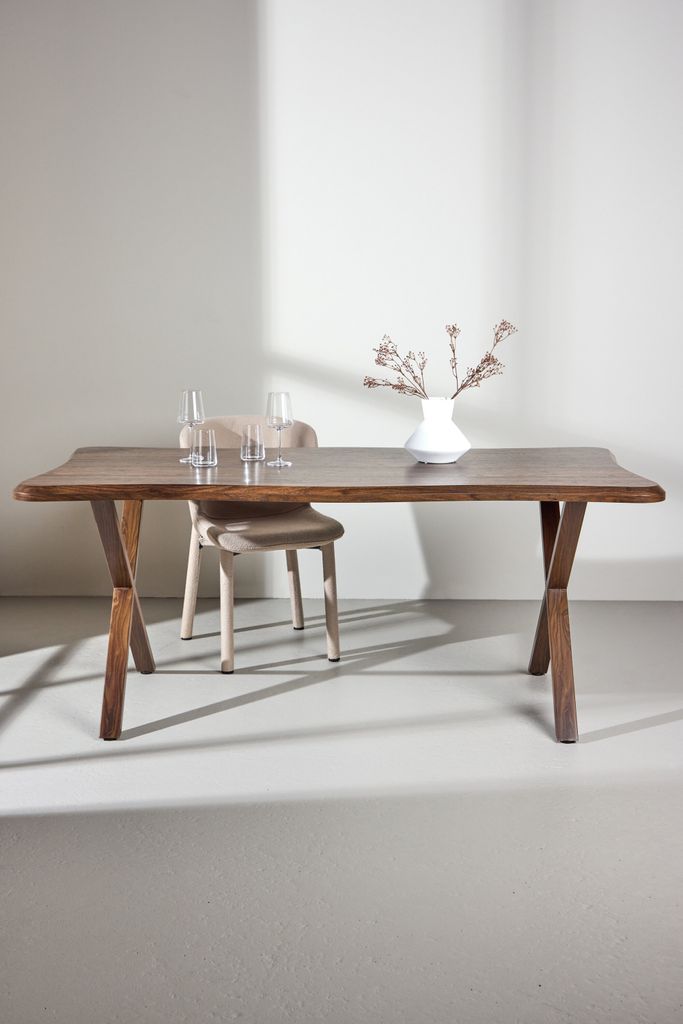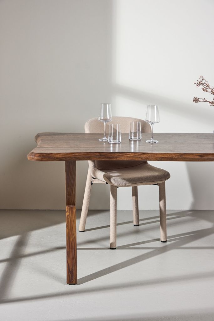 Fiona matbord i varm mocca-ton med unik vågig bordsskiva, perfekt för både vardag och fest.