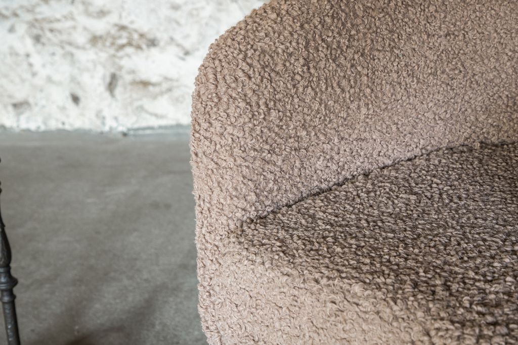 Mysig brun teddyfåtölj med runda former och stilrena ben i svart metall, perfekt för ökad komfort och stil.