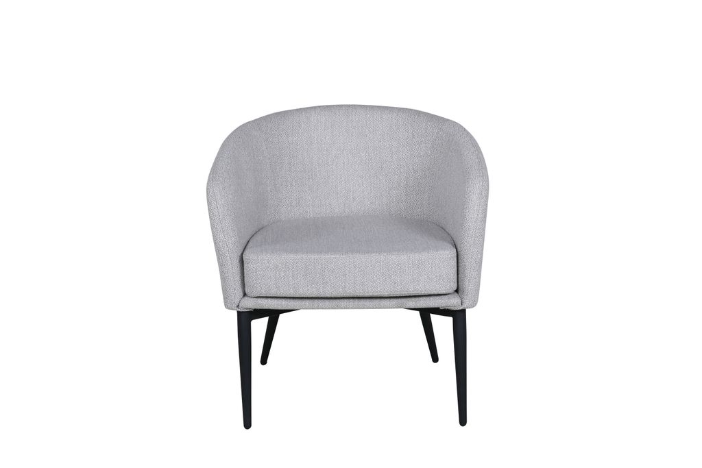 Modern fåtölj i stilren grå kulör med rundad rygg och sits i polyesterlinne. Bekväm och stilfull, perfekt för vardagsrummet.