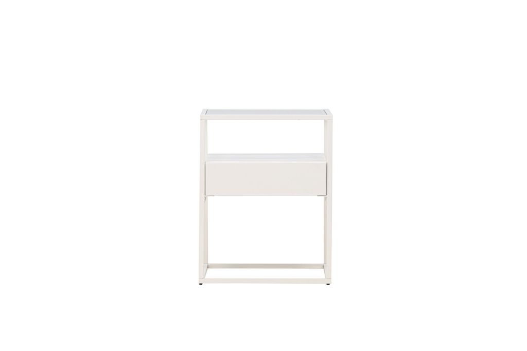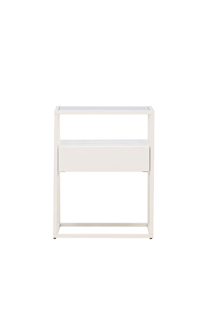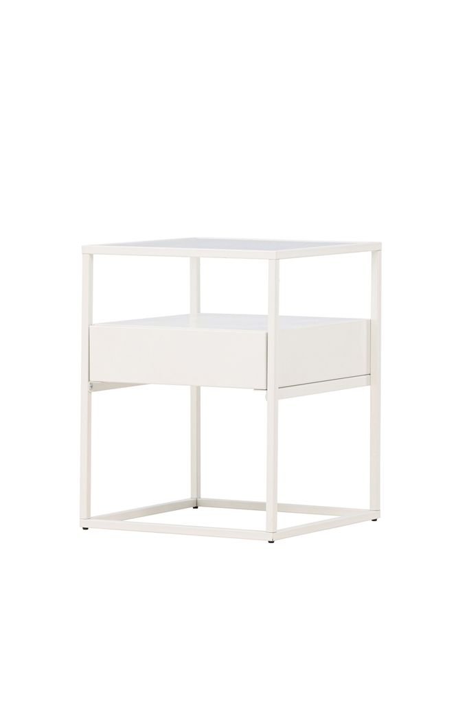 Det nätta bordet är utrustat med en diskret låda och ett hyllplan, vilket gör det enkelt att hålla ordning på alla dina tillhörigheter. Använd det som ett nattduksbord eller placera det i vardagsrummet för en elegant touch. Den vita färgen smälter in i de flesta inredningsstilar, och för ett mer djärvt uttryck finns också en svart variant.