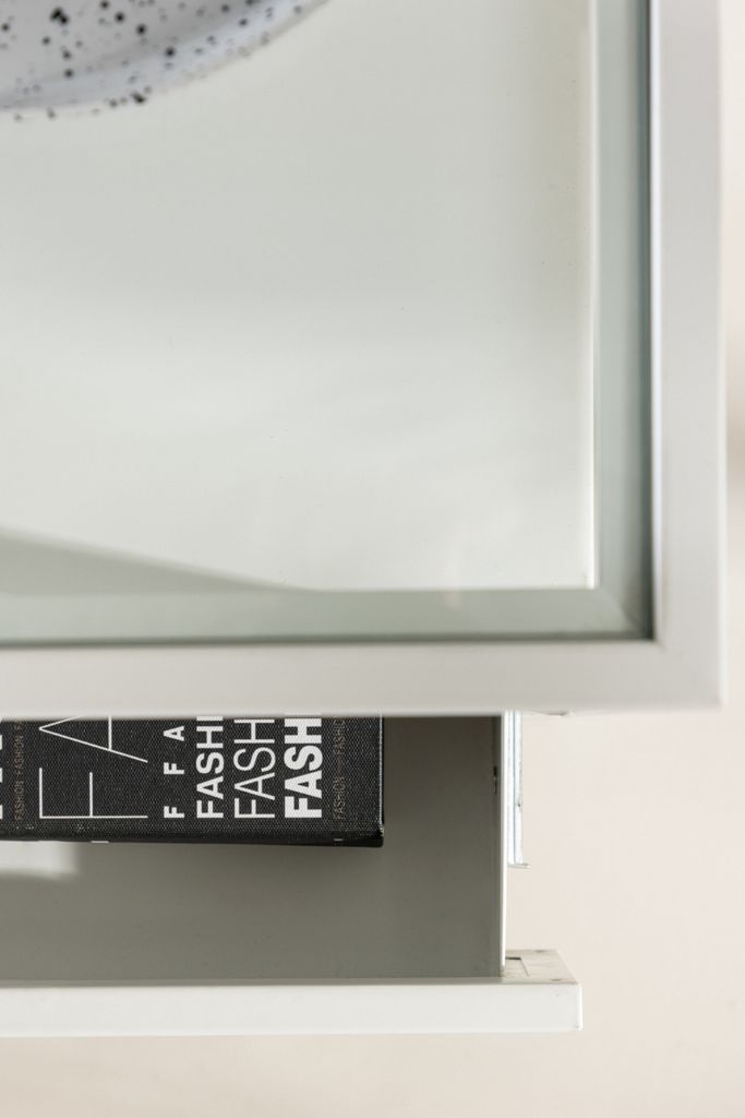 Elegant vitt sidobord i glas och stål med smart förvaring. Perfekt för sovrum eller vardagsrum.