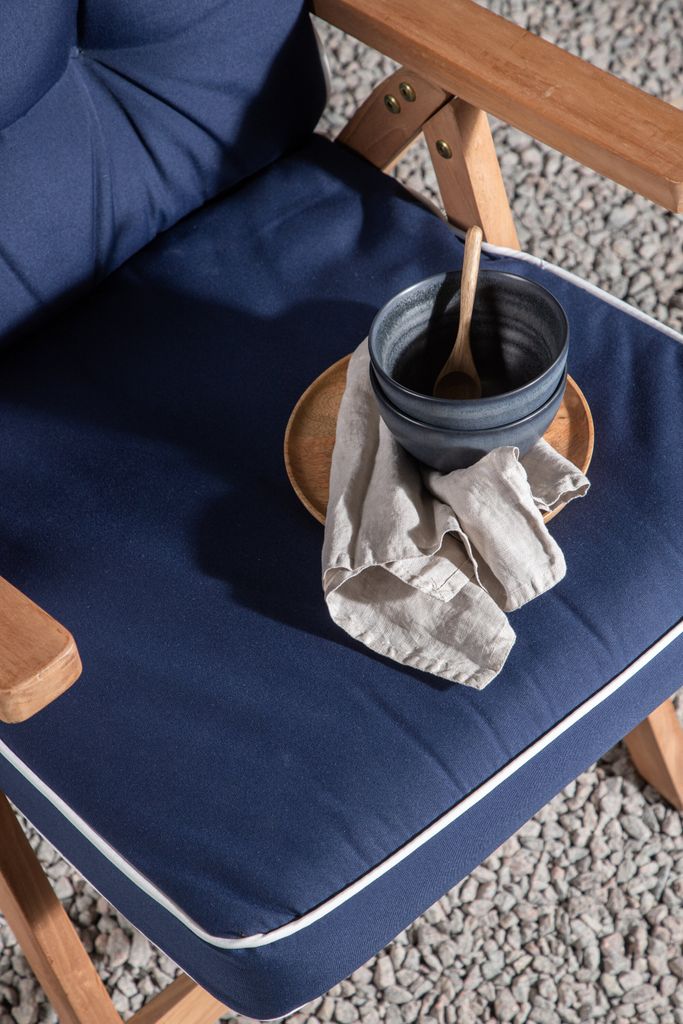 Robust seglarstil i blått för utemöbler. Tjockare dyna med snören för extra komfort och stabilitet.