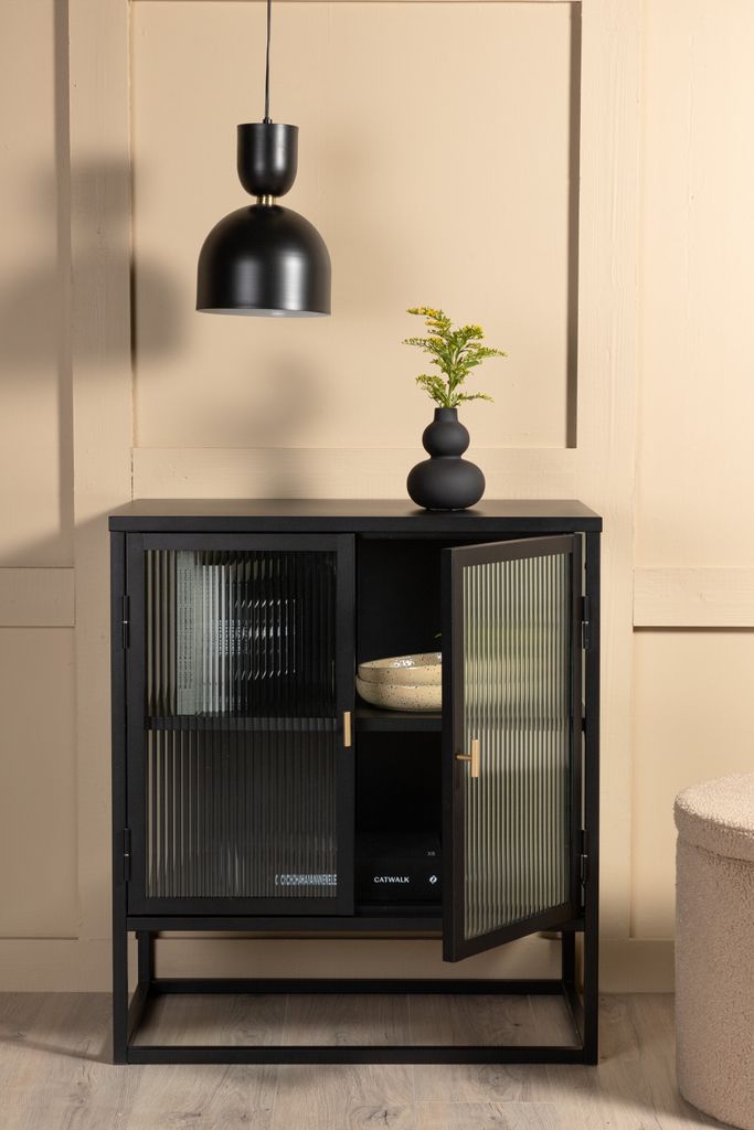 Välkommen till en värld av sofistikerad förvaring med vårt Venture Home Garis förvaringsskåp. Detta skåp kombinerar estetik med funktion i en stilren skandinavisk design. Den svarta ramen i pulverlackerat stål ger ett modernt uttryck, medan de veckade glasdörrarna tillför en subtil elegans.